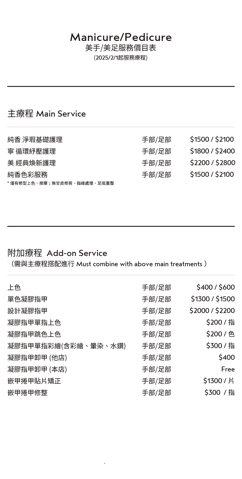 *為了您的衛生及手部安全,我們將視手部與足部疾病及外傷程度,保留提供服務之權利,敬請見諒。