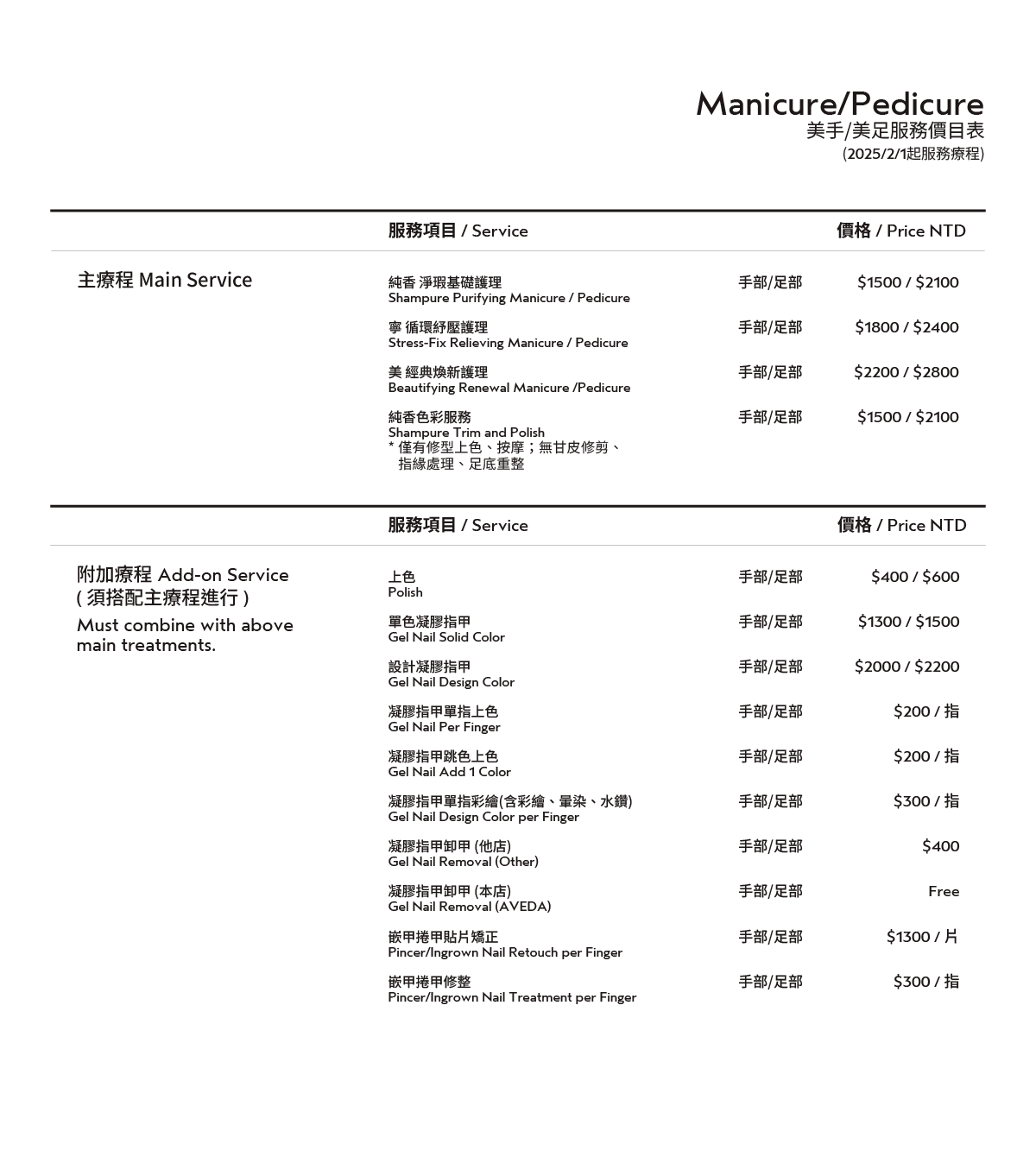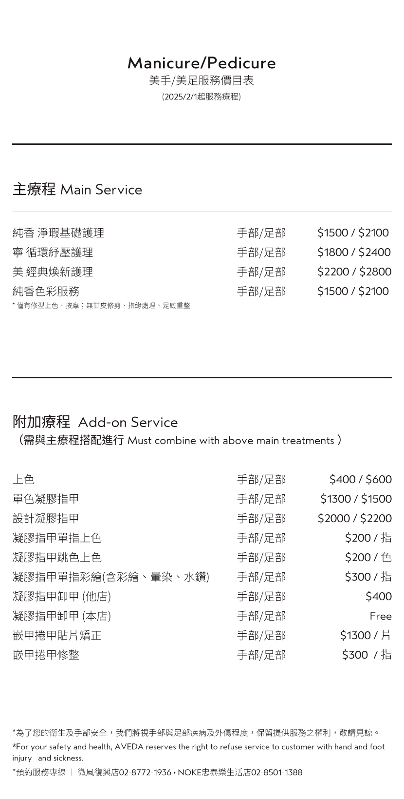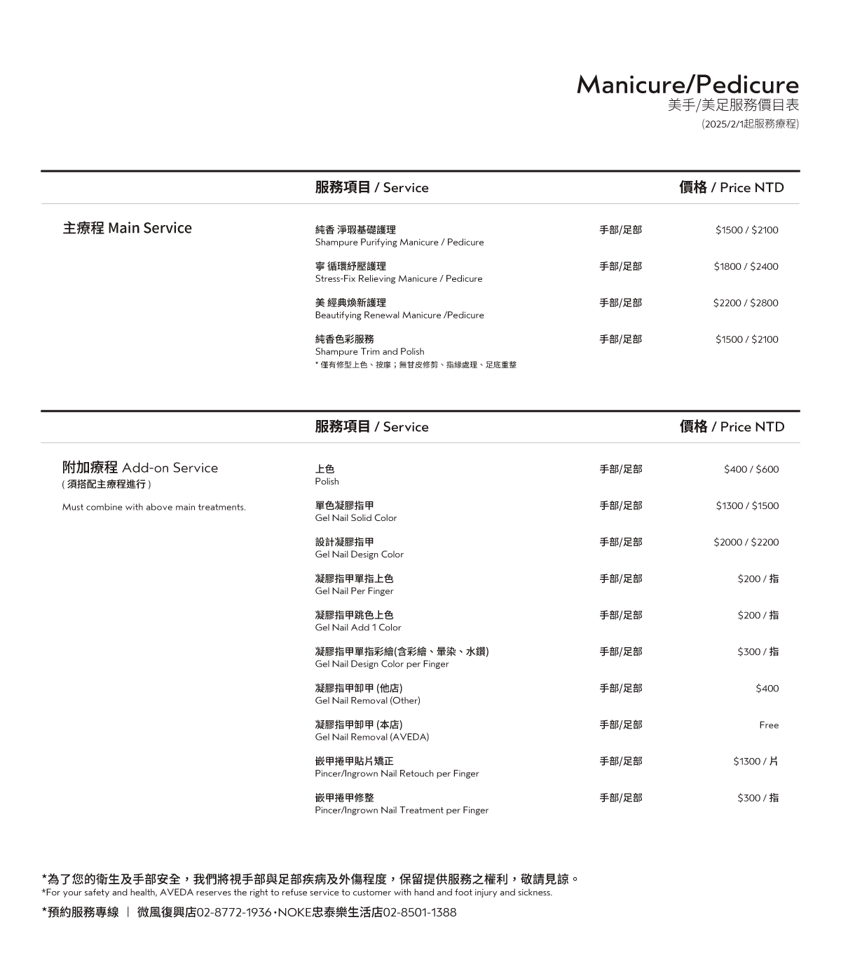 *For your safety and health, AVEDA reserves the right to refuse service to customer with hand and foot injury and sickness.