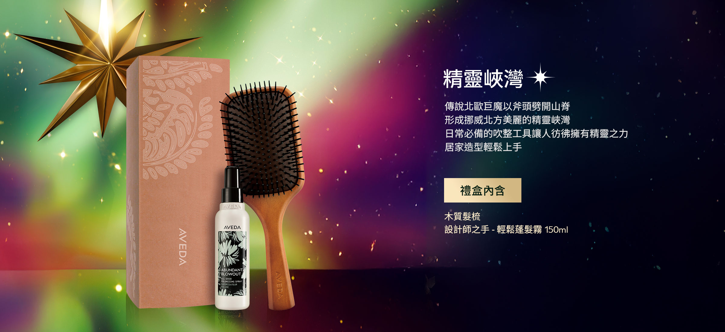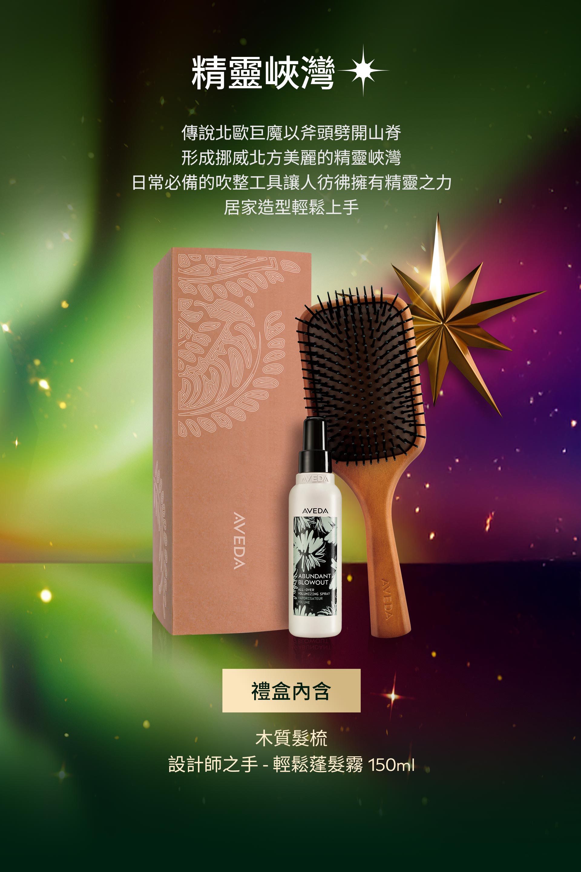 傳說北歐巨魔 Hinnøygubben 以斧頭劈開山脊,形成了挪威北方美麗的精靈峽灣。「精靈峽灣」禮盒內包含「隨行按摩梳」及全新「設計師之手 - 輕鬆蓬髮霧」,兩項吹整必備工具讓人彷彿擁有精靈之力,居家造型也能像專業設計師一般輕鬆上手。