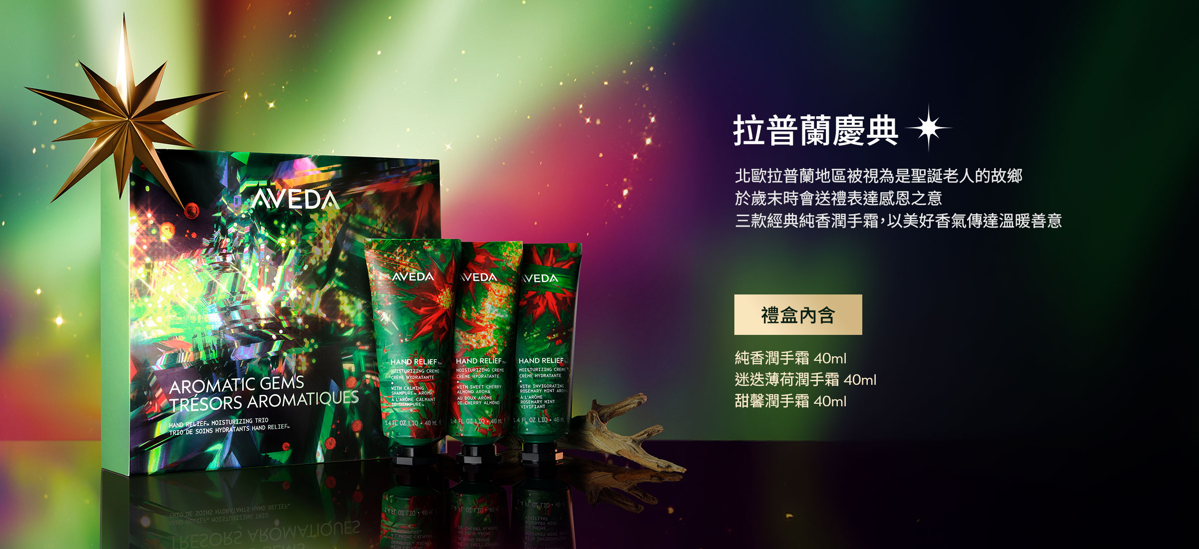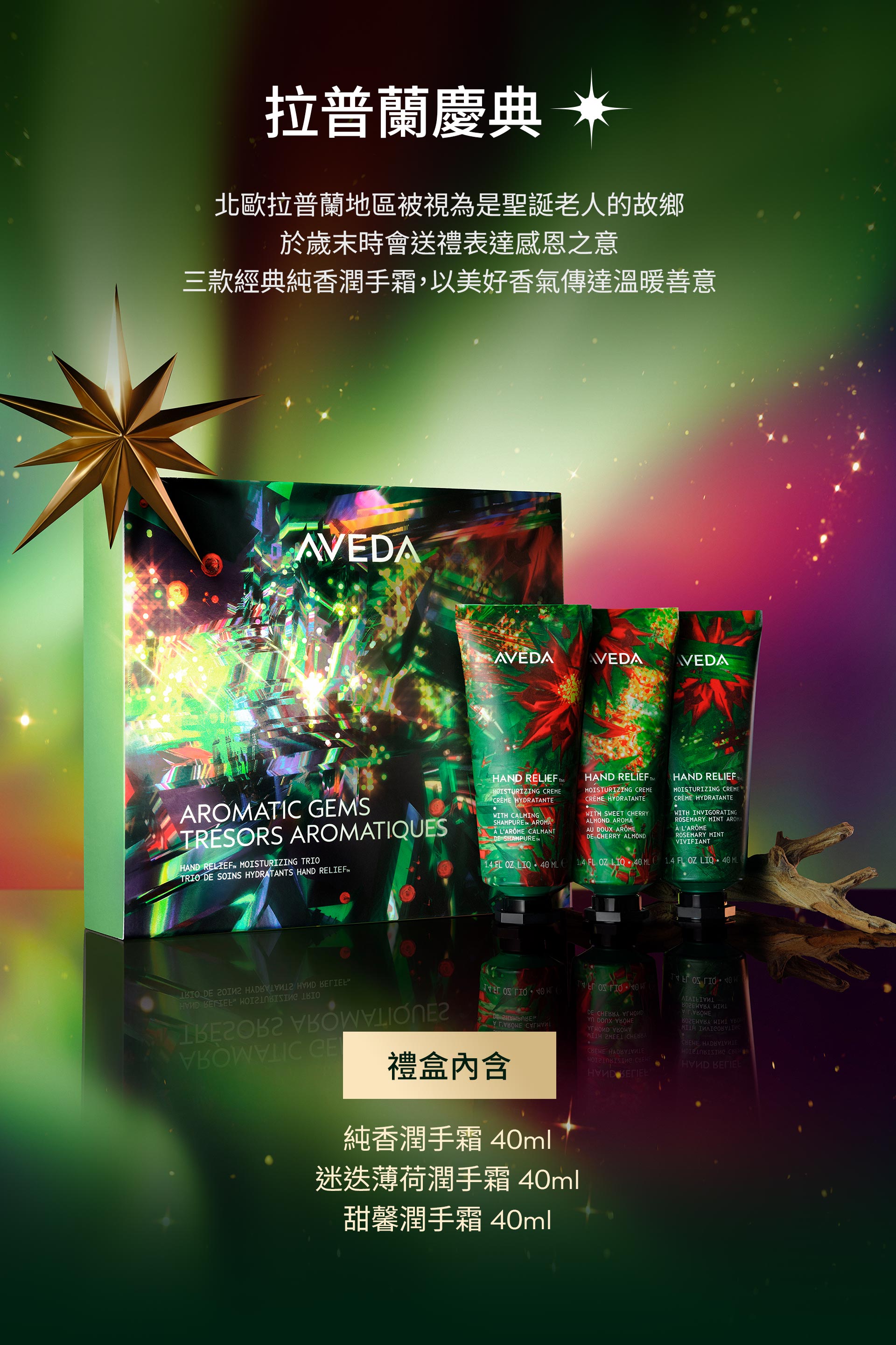 北歐拉普蘭地區被視為是聖誕老人的故鄉,由芬蘭人效法「聖尼古拉斯」悄悄送禮給需要的人。在「拉普蘭慶典」禮盒中囊括了三款 AVEDA 經典純香潤手霜,最適合在歲末時節分享給在乎的人,用美好香氣延續源自拉普蘭的無私善意。